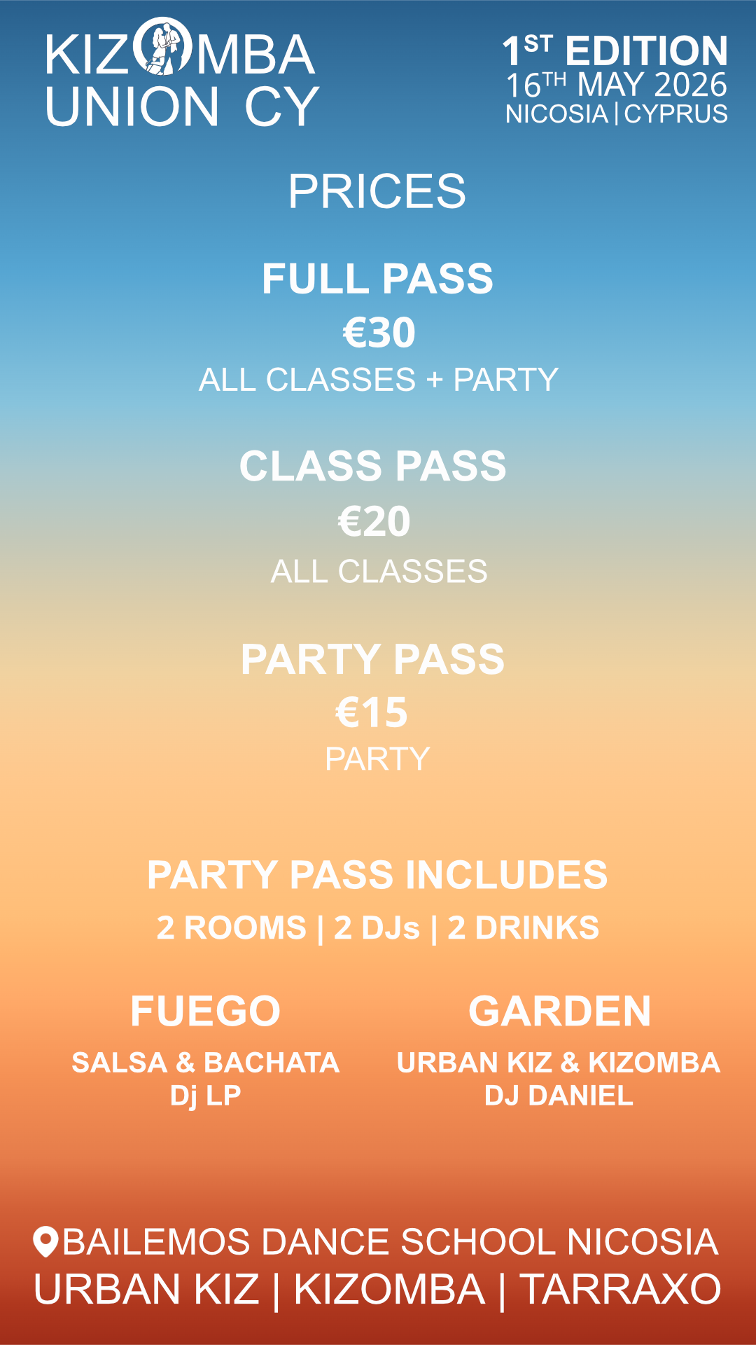 When you send the payment, please use this reference so we can match your pass. Example: KUCY Maria Papadopoulou FULL for a €30 full pass, or KUCY Andreas Georgiou PARTY for the €15 party ticket.